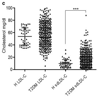 平頂山市人民醫(yī)院內(nèi)分泌與代謝科的田勇等人[5],招募了包括352名T2DM患者(男194名,女158名,平均年齡60.63歲)和48名健康人(男34名,女14名,平均年齡45.38歲)的受試者。探討多基因多態(tài)性、LDL-C和sdLDL-C在T2DM治療中的臨床價值。研究時間從2018年5月至2020年1月。研究發(fā)現(xiàn),sdLDL-C主要存在于T2DM患者體內(nèi),且T2DM患者sdLDL-C的平均水平高于健康人。治療后,LDL-C和sdLDL-C的表達較治療前降低且差異顯著(p?0.001)。結(jié)果表明,sdLDL-C是T2DM的高危因素。LDL-C和sdLDL-C是T2DM治療的良好監(jiān)測生物標志物。