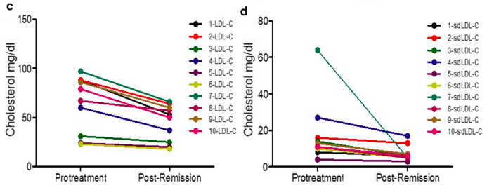 10例T2DM患者(男6例,女4例)治療前后檢測LDL-C,sdLDL-C的水平。數(shù)字1到10代表病人1到10