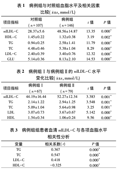 齊齊哈爾醫(yī)學院附屬第三醫(yī)院的楊秀靜等[6],將146例T2DM患(其中男85例,女61例;年齡30~70歲)中單純T2DM患者67例為病例組Ⅰ,T2DM及并發(fā)癥患者79例為病例組Ⅱ;另選擇同期健康體檢者107名作為對照組。兩組均進行sd LDL-C、GLU、TC、TG、LDL-C、HDL-C檢測。觀察T2DM及其并發(fā)癥患者血清中sdLDL-C水平變化情況并分析其臨床應(yīng)用價值。研究結(jié)果表明,sd LDL-C在T2DM患者中升高明顯,sd LDL-C與TG、TC、LDL-C呈正相關(guān)與HDL-C呈負相關(guān)。觀察sd LDL-C的變化情況可用于預測T2DM并發(fā)癥病變發(fā)生風險。
