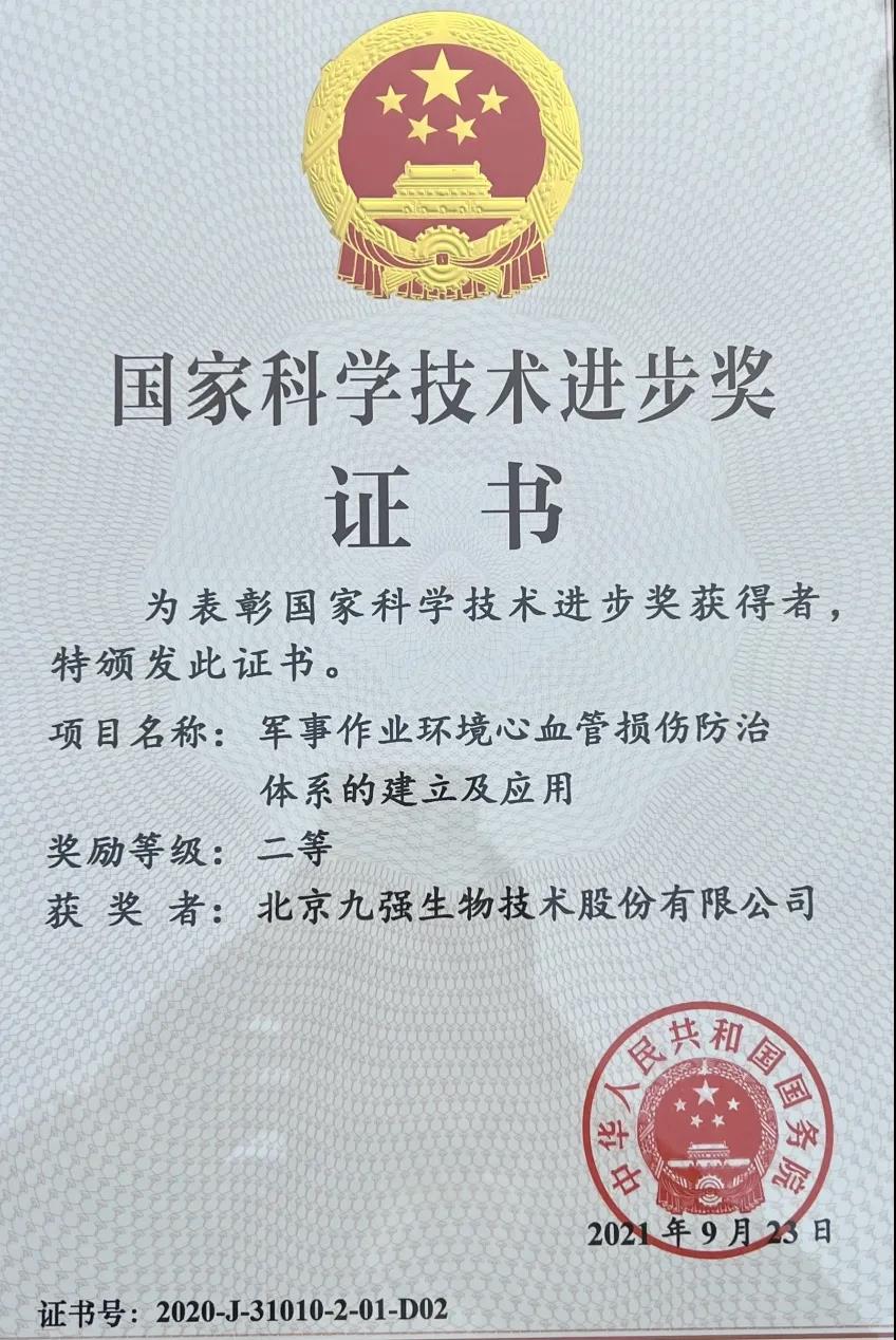 2021年11月3日,2020年度國家科學技術獎勵大會在人民大會堂正式召開。中國人民解放軍總醫(yī)院何昆侖、田亞平兩位教授團隊領銜,與北京九強生物技術股份有限公司共同合作完成的“軍事作業(yè)環(huán)境心血管損傷防治體系的建立及應用”榮獲2020年度國家科技進步二等獎。九強生物總經理劉希出席了頒獎現場并領獎。