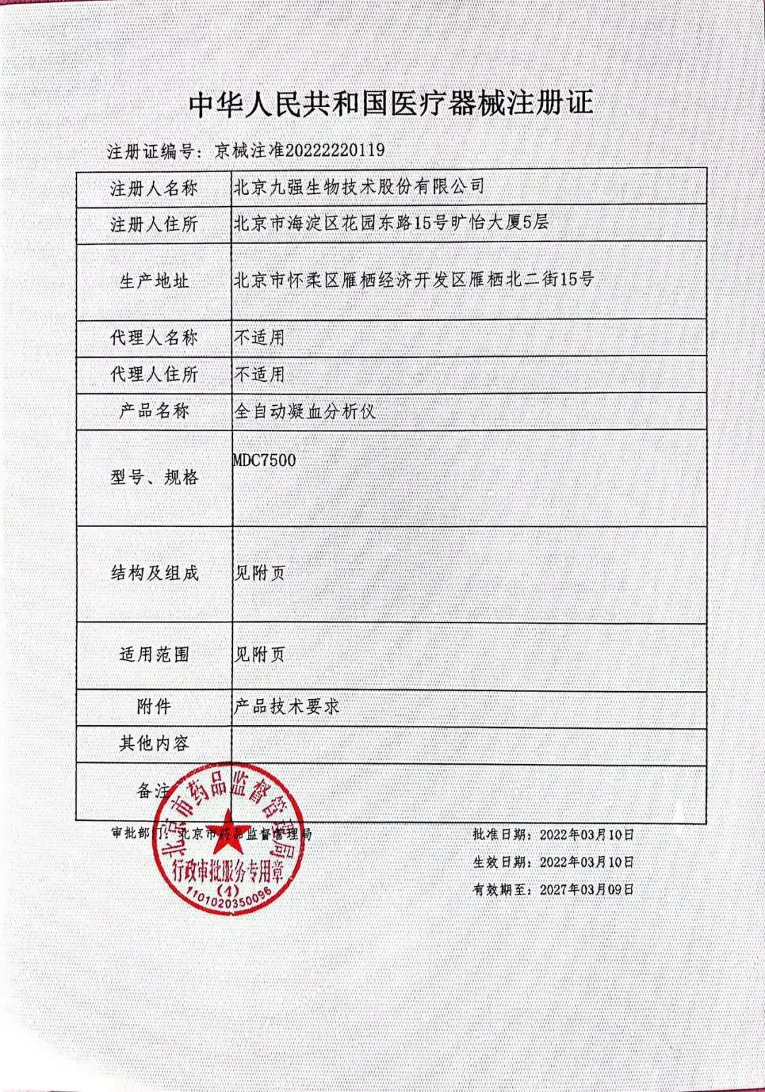 九強(qiáng)生物全自動(dòng)凝血分析儀MDC7500順利取得北京市藥品監(jiān)督管理局頒發(fā)的《醫(yī)療器械注冊(cè)證》。