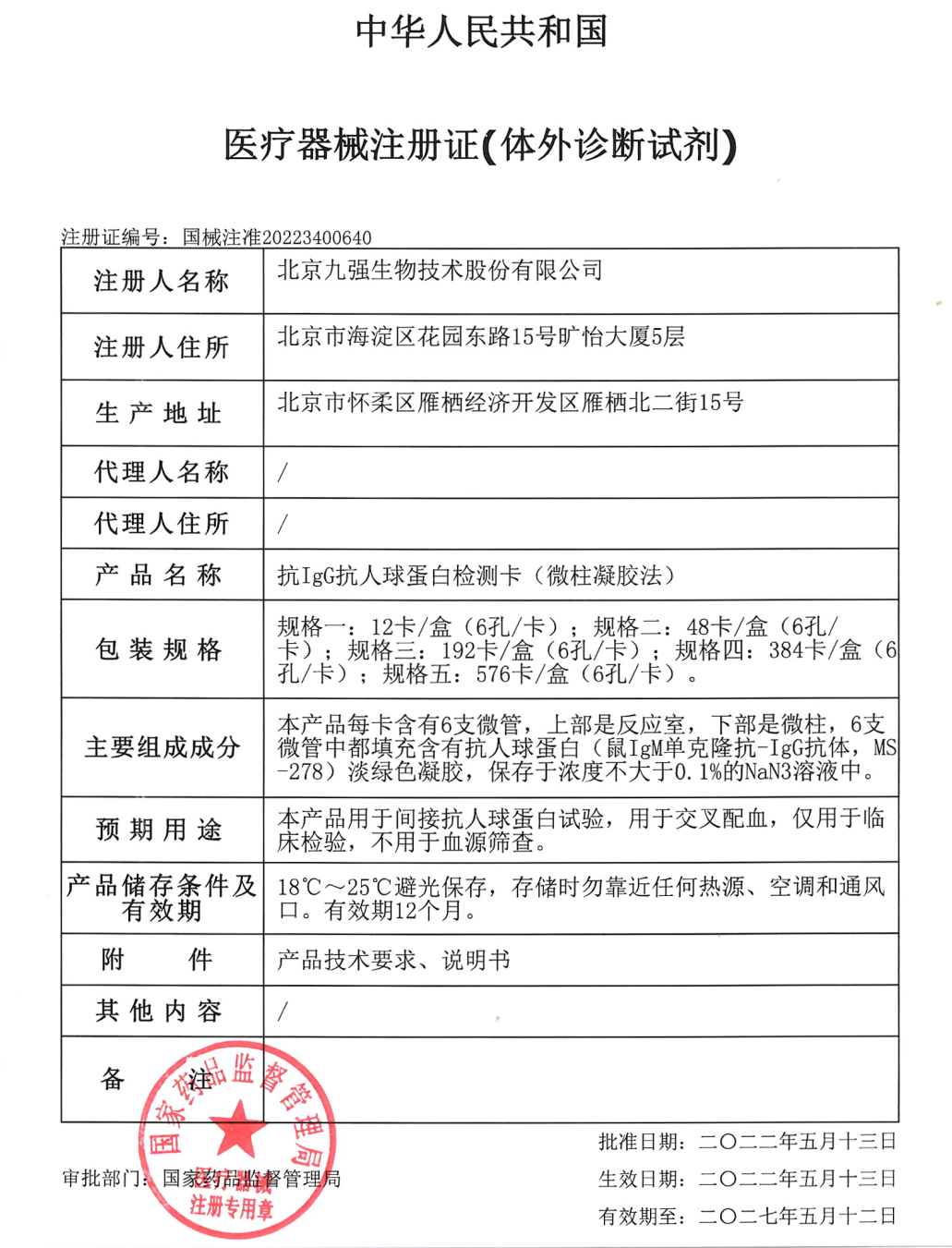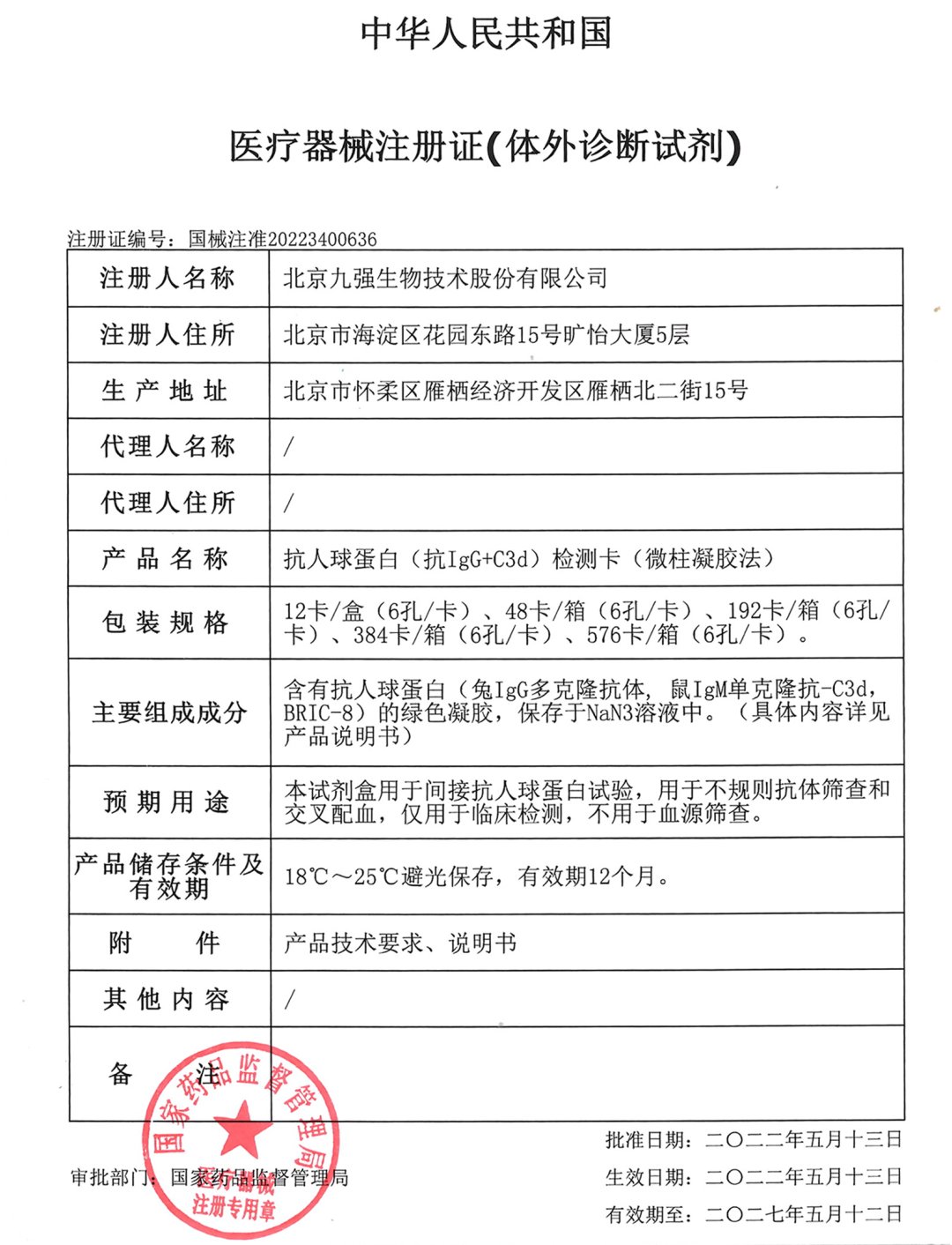 九強(qiáng)生物順利取得國家藥品監(jiān)督管理局頒發(fā)的抗人球蛋白(抗IgG+C3d)檢測(cè)卡(微柱凝膠法)和抗IgG抗人球蛋白檢測(cè)卡(微柱凝膠法)的《醫(yī)療器械注冊(cè)證》。