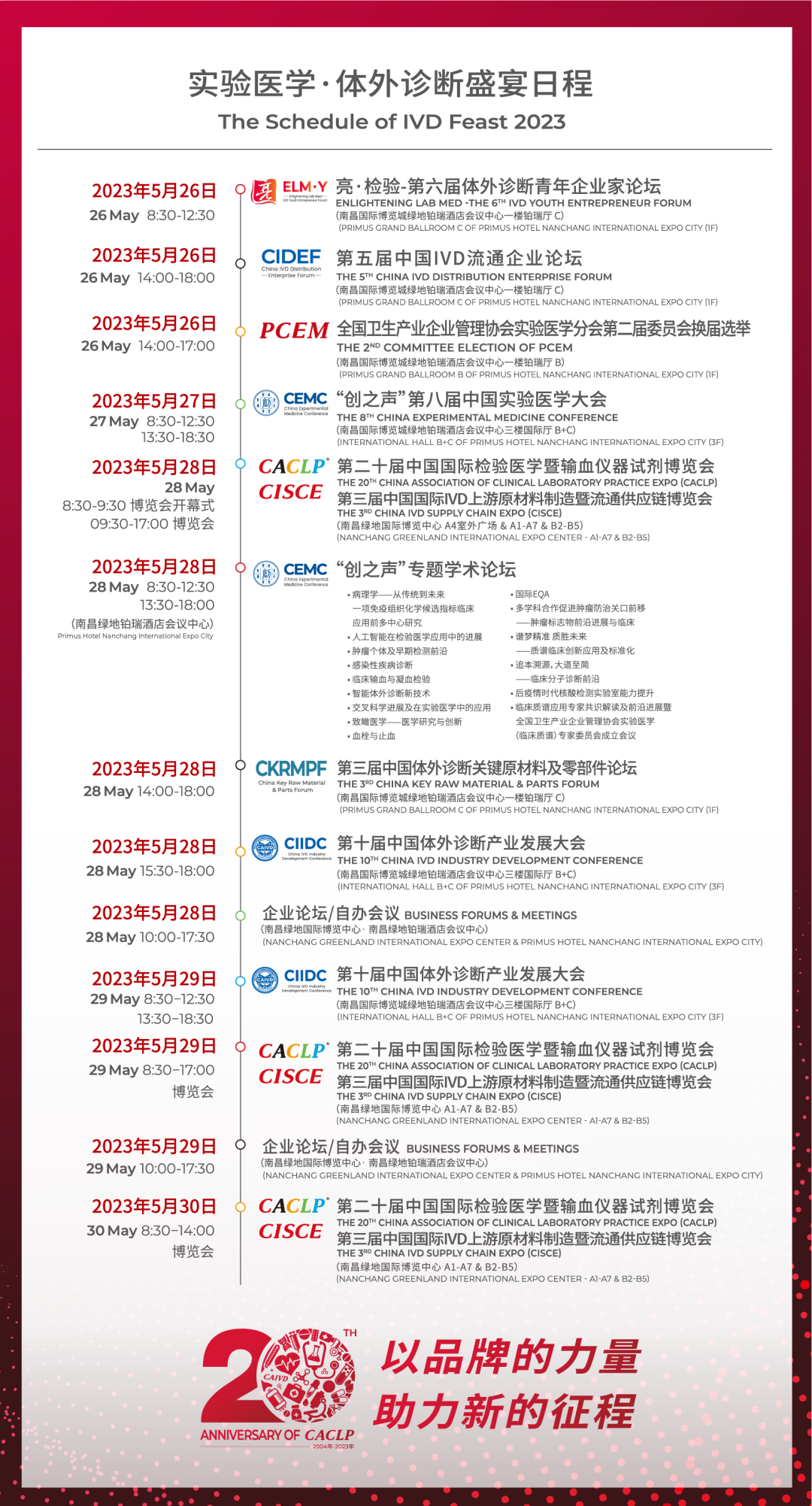 第二十屆中國國際檢驗(yàn)醫(yī)學(xué)暨輸血儀器試劑博覽會(huì)(CACLP),第三屆中國國際IVD上游原材料制造暨流通供應(yīng)鏈博覽會(huì)(CISCE)將于2023年5月28日-30日在南昌綠地國際博覽中心舉行。
