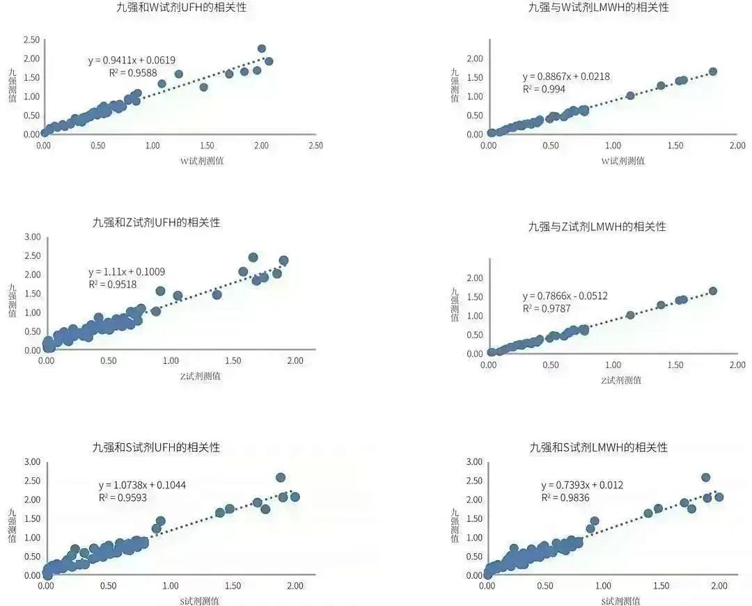 (2)國產抗Xa試劑可以滿足臨床預期用途:九強抗Xa試劑盒普通肝素線性可以做到4IU/mL,不僅可以滿足說明書所宣稱的1.2IU/mL,同時可以滿足臨床上的一些異常特殊高值樣本的檢測需求;