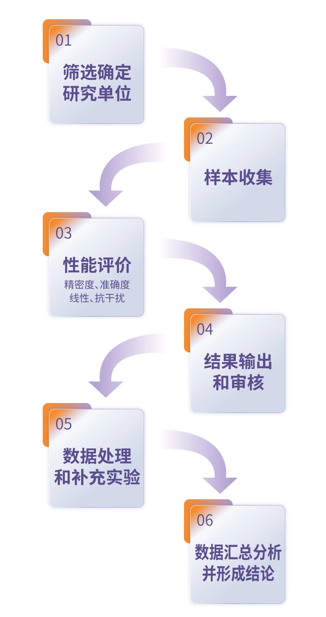 多中心性能驗證,要求至少3家單位在規(guī)定時間內(nèi)、依據(jù)同一實驗方案并使用相同批號試劑對項目性能進行評估,最終匯總各單位檢測結(jié)果進行比對及綜合評估。