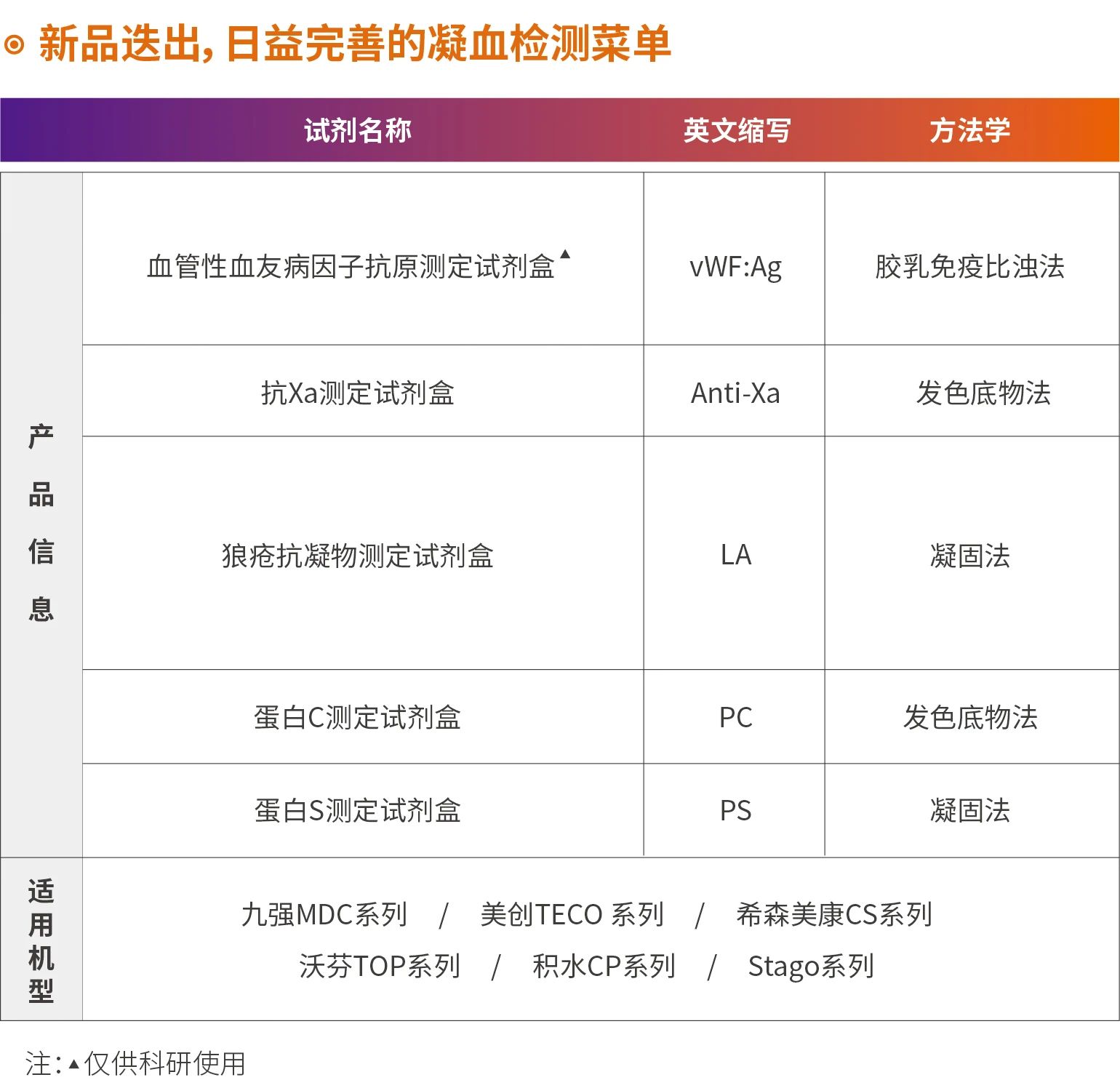 九強生物是中國領先的臨床體外診斷產(chǎn)品與服務供應商之一,目前擁有自主研發(fā)的全自動凝血檢測分析儀MDC7500和MDC3500以及德國原裝進口的Coatron5000、Coatron3000和Coatron1800,專業(yè)配套的凝血檢測試劑在滿足自有檢測系統(tǒng)的同時也能完美匹配主流血凝檢測系統(tǒng),滿足不同客戶的需求,為臨床提供全面的血栓與止血實驗室解決方案。