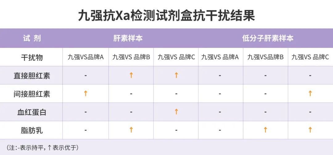九強生物抗Xa檢測試劑盒多中心驗證數(shù)據(jù)顯示:九強抗Xa檢測試劑盒抗干擾能力優(yōu)于進口主流廠家配套試劑。九強試劑檢測普通肝素/低分子肝素樣本時,干擾物濃度低于以下濃度(直接膽紅素20mg/dl,間接膽紅素10mg/ml,血紅蛋白500mg/dl,脂肪乳400mg/dl)時無顯著干擾,回收率在90-110%。