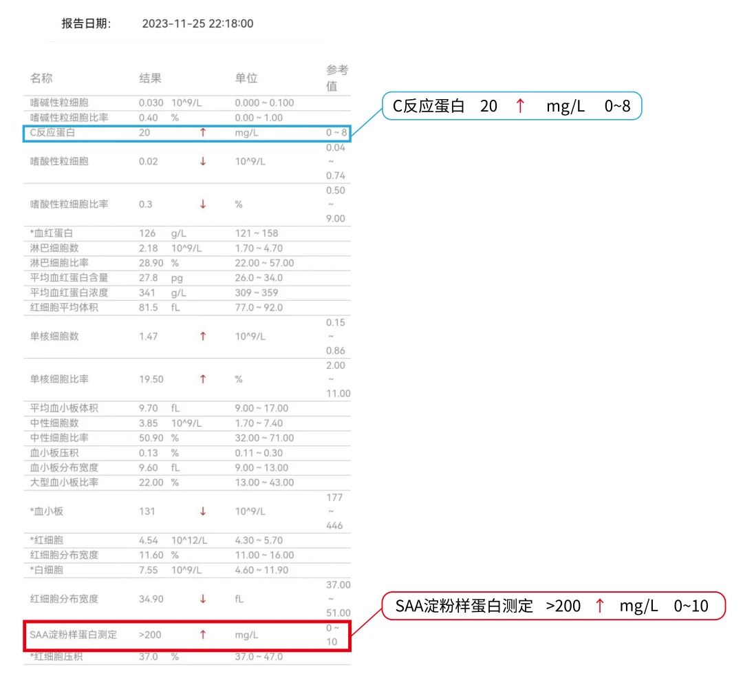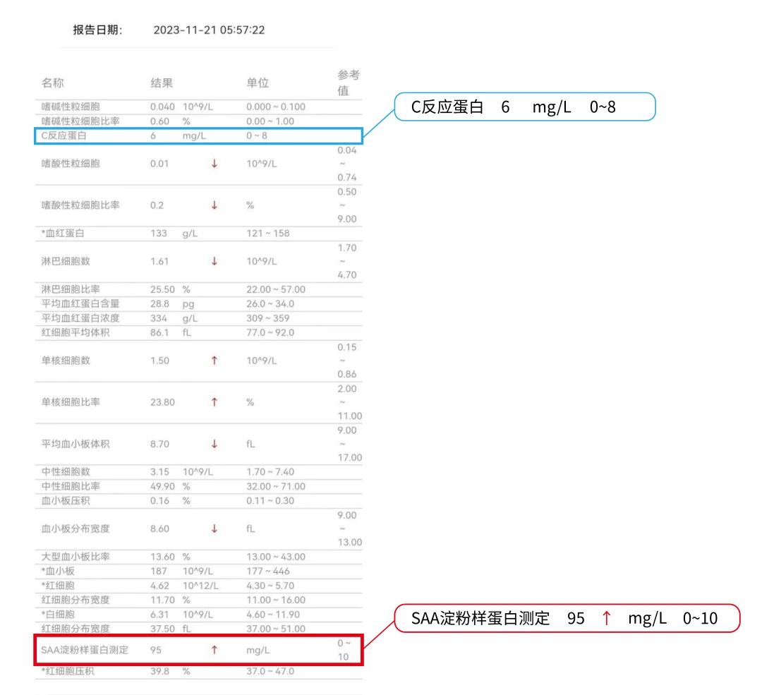 檢測(cè)結(jié)果分析:CRP在感染早期未升高,SAA早期升高到參考值上限9倍;隨著病情嚴(yán)重,CRP與SAA均升高,SAA為參考值上限20倍。