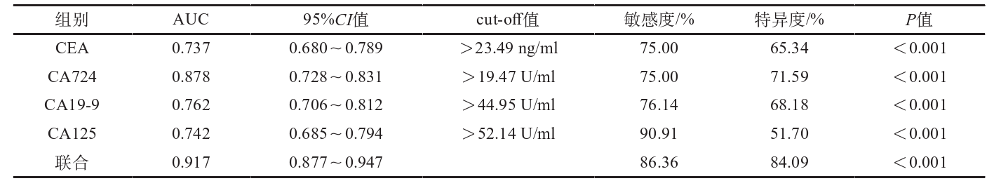 研究表明,血清CA72-4聯(lián)合CEA、CA19-9、CA125診斷胃癌的AUC大于各指標(biāo)單獨(dú)診斷,靈敏度、特異度分別為86.36%、84.09%,表明血清CA72-4、CEA、CA19-9、CA125 聯(lián)合可提高胃癌診斷價(jià)值。
