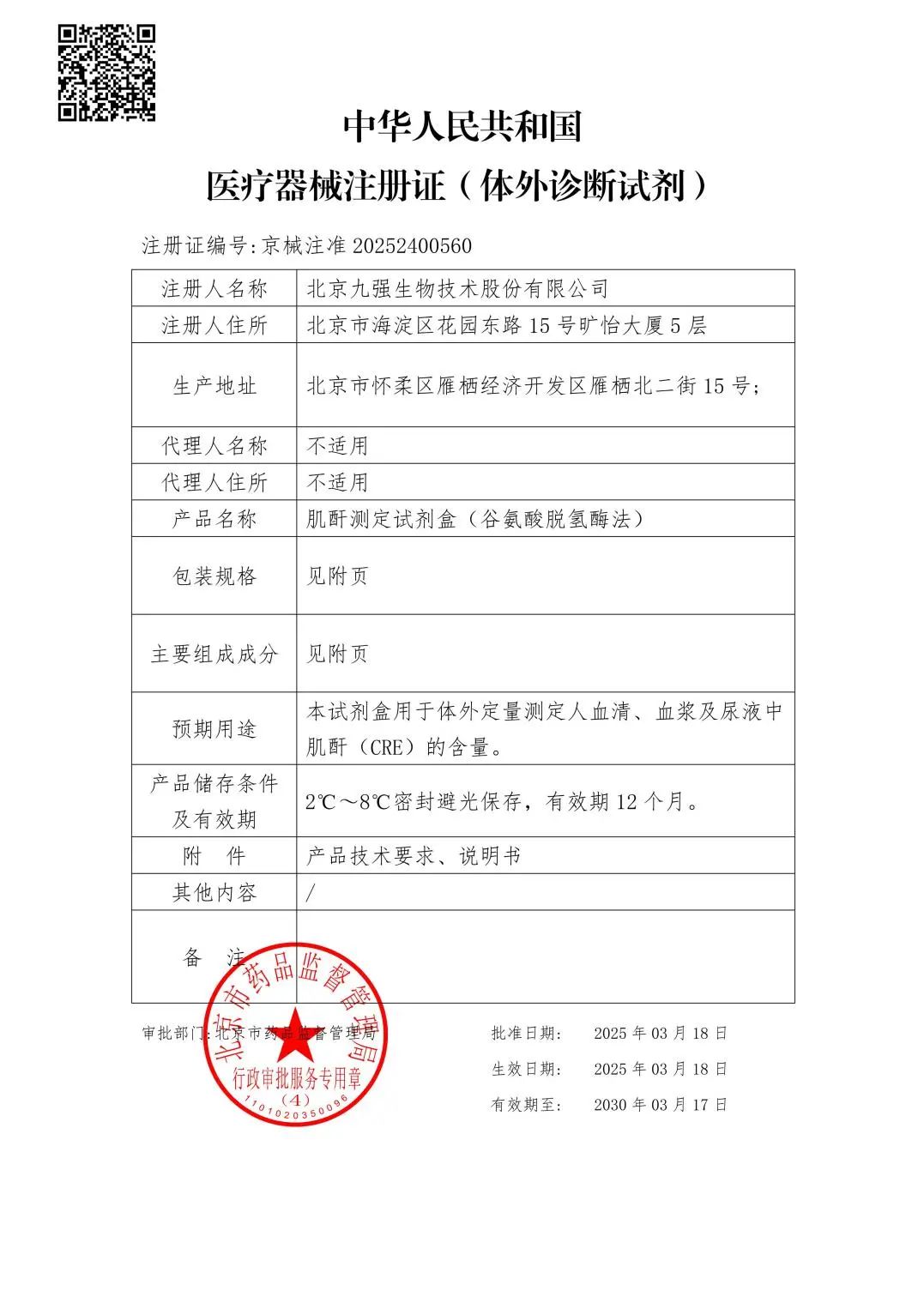 再添利器!九強(qiáng)生物肌酐測(cè)定試劑盒獲證!