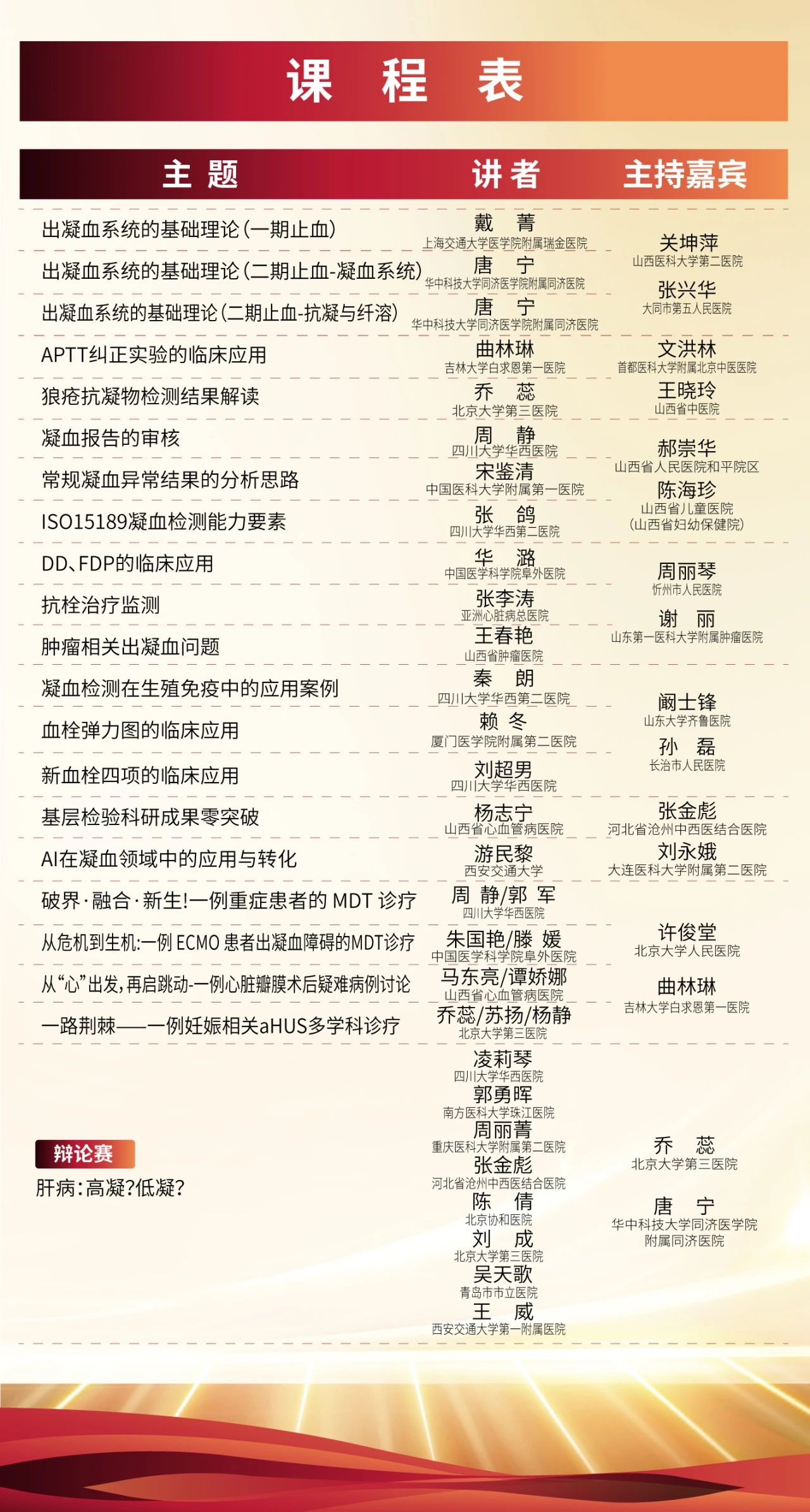 本次培訓(xùn)邀請國內(nèi)凝血領(lǐng)域知名專家授課,課程內(nèi)容涵蓋出凝血系統(tǒng)基礎(chǔ)理論、多學(xué)科聯(lián)合診療(MDT)經(jīng)典案例拆解,辯論賽以及AI在凝血領(lǐng)域的應(yīng)用。