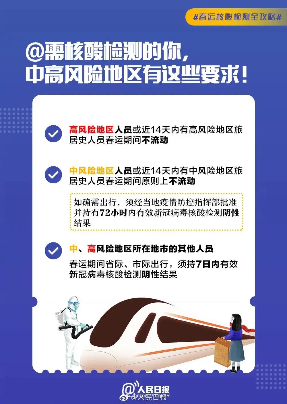 今天是2021春運(yùn)第1天。高中低風(fēng)險(xiǎn)地區(qū)有哪些具體要求?什么情況需要做核酸檢測(cè)?如何預(yù)約?核酸檢測(cè)必知注意事項(xiàng)有哪些?**要求↓↓有用,擴(kuò)散周知!